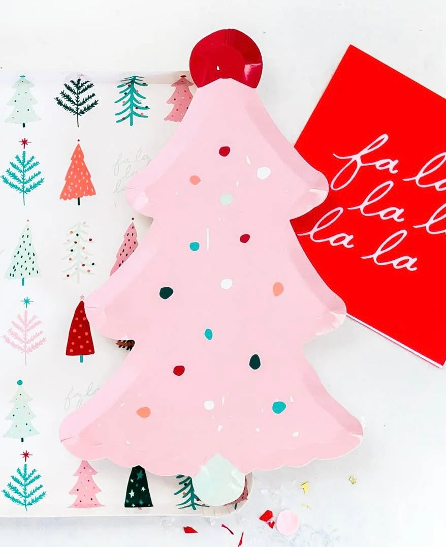 Pink Christmas tree paper plates - 8 pk